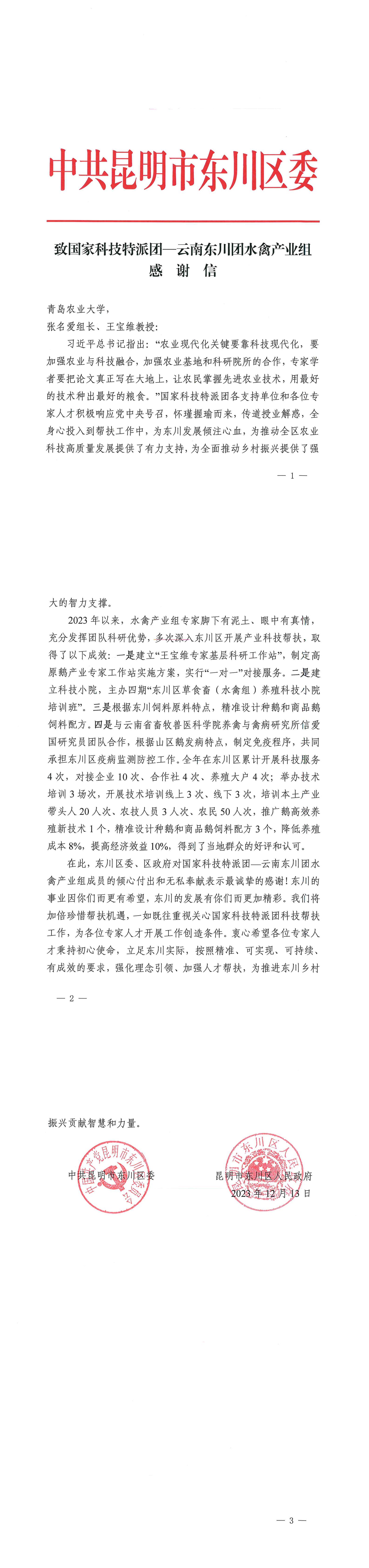 近日,昆明市东川区委向学校发来感谢信,表达对我校国家科技特派团—云南东川团水禽产业组张名爱组长、王宝维教授的感谢,对两位专家及服务团队在东川区的倾心付出和无私奉献表示诚挚谢意。