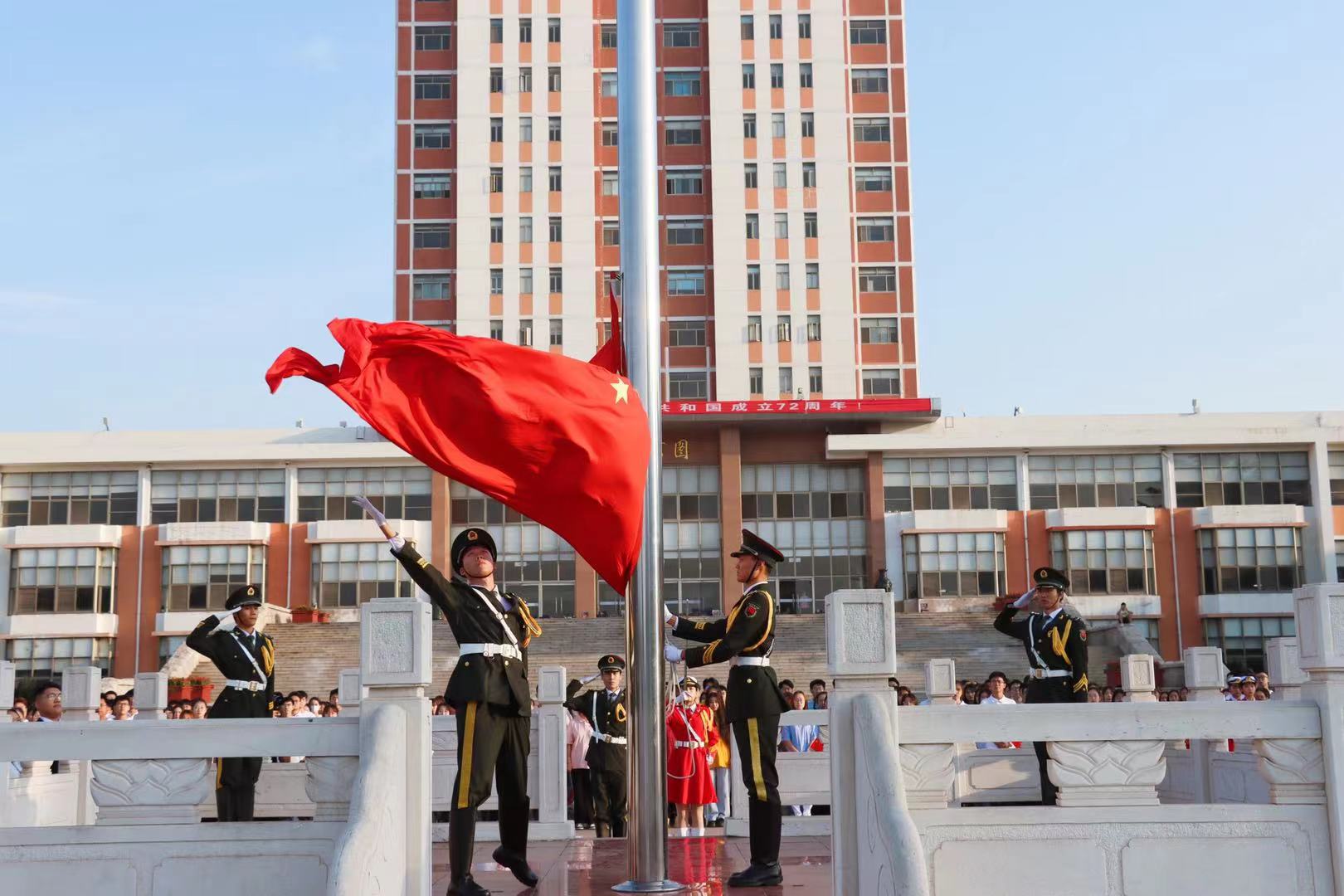 升旗仪式上,国旗护卫队英姿飒爽、步履铿锵,迈着整齐划一的步伐庄严护送五星红旗入场。擎旗手挂旗、抱旗,随着国歌响起,五星红旗在擎旗手手中展开,与十月初升的朝阳一同冉冉升起,全体人员行注目礼,共唱国歌。